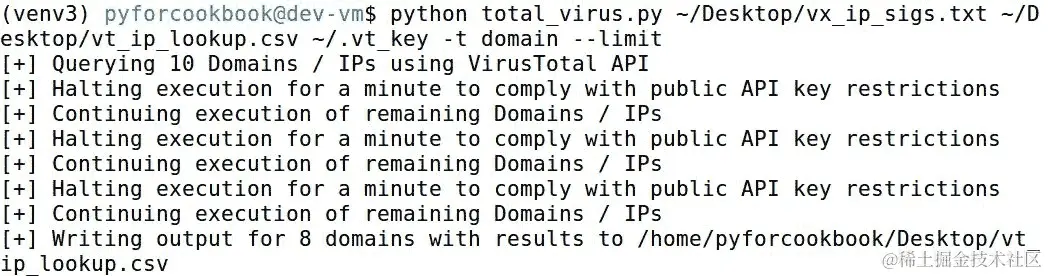 以下截图反映了当我们针对文件和哈希运行脚本时的情况,以及针对域名和 IP 运行脚本时的情况: