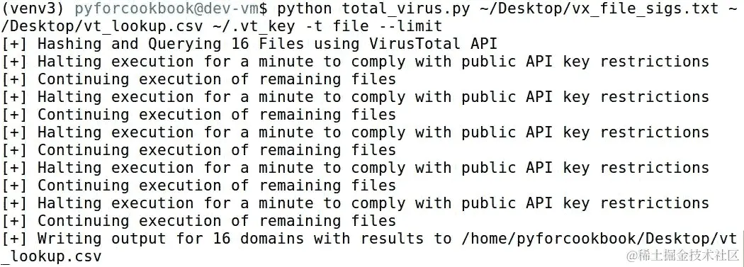 如果 API 调用成功并且文件已经存在于 VirusTotal 数据库中,我们将 JSON 数据附加到列表中。再次,我们对计数和限制进行检查,以确保遵守公共 API 限制。完成所有 API 调用后,我们将 JSON 数据列表返回给main()函数进行输出。