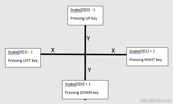 我们在上一章中制定了这个逻辑,并将使蛇向上、向下、向左或向右移动。我们可以将屏幕想象成一个包含行和列的矩阵。通过向上的动作,蛇将在 Y 轴上移动,因此 y 位置应该减小;同样,通过向下的动作,蛇将向下移动 Y 轴,因此我们需要增加 y 坐标。对于蛇的左右移动,我们将分别减小和增加 X 轴。
