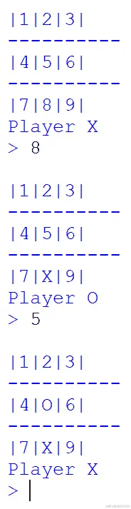 break语句。我们已经学会了break关键字将终止我们的循环。在主循环的主体中,我们打印出是玩家 X 还是 O 轮到了,以使玩家意识到轮到他们了。 -