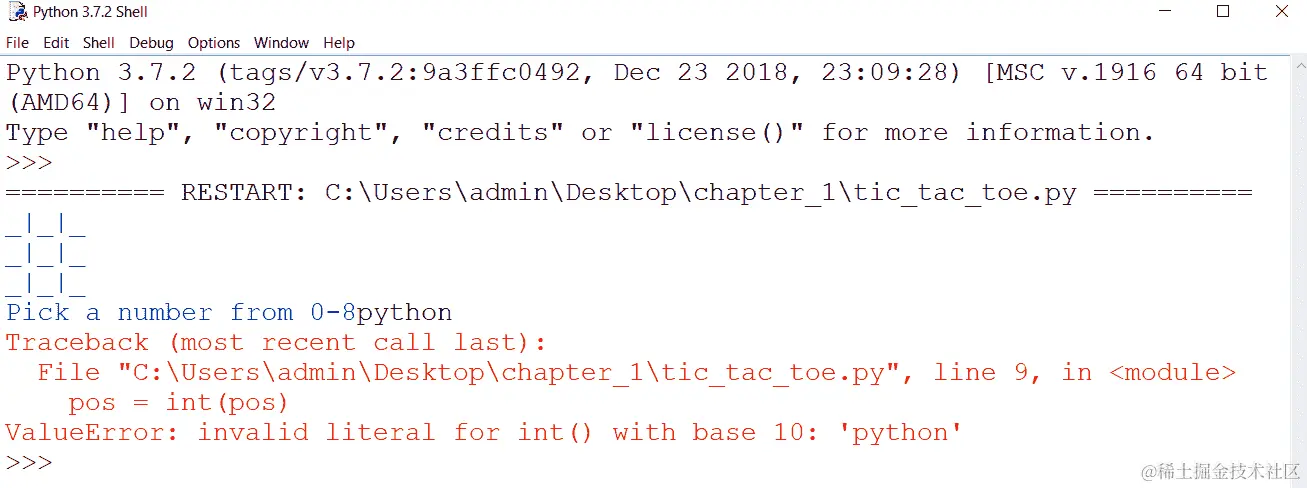 在这里,我们将 Python 字符串值输入到输入字段中。而不是使程序崩溃,我们得到了一条消息,说请只输入来自棋盘的有效字段。这是使用try和except块处理异常的一种方便的方法。我们使用了前一章的相同主循环,它将无限次循环。在try块的主体中,我们保留可能引发异常的代码。strip()是一个字符串方法,将从用户的输入中删除空格。我们必须使用int方法对用户输入进行类型转换,以便将以字符串形式的输入数据转换为整数。如果我们遇到异常,我们将执行except块中的代码。continue关键字将使主循环再次从头开始运行,如果我们遇到异常。