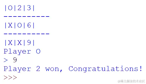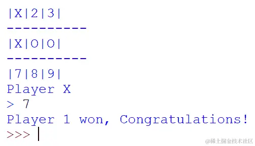 因此,我们必须将这个加到 1,这样当前玩家就确定为赢家,而不是下一个玩家。由于这是一个双人游戏,这是有道理的。让我们运行我们的代码来检查结果: