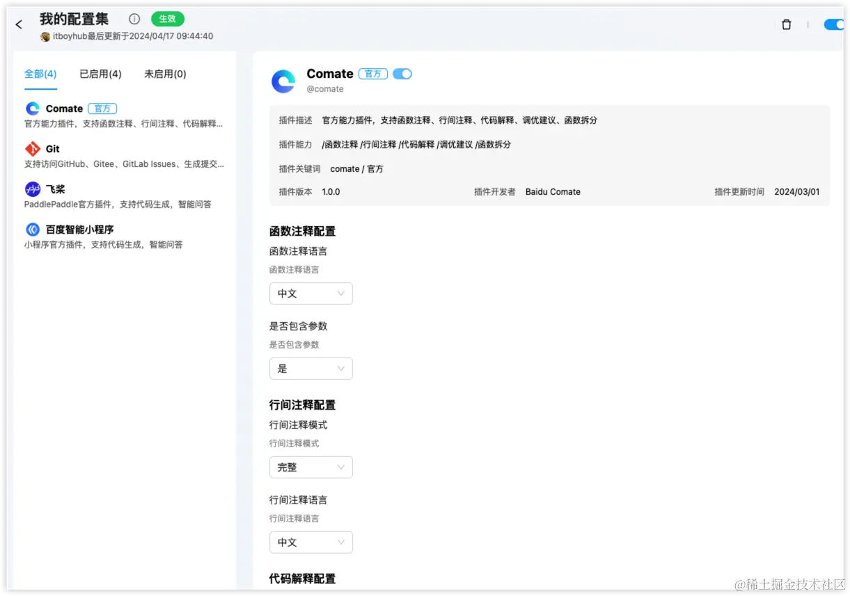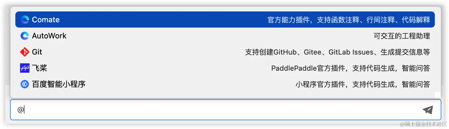 Comate 提供了一些插件的能力,不过目前支持的插件不多。在和 Comate 交互的时候,通过 @ 可以唤起插件。
