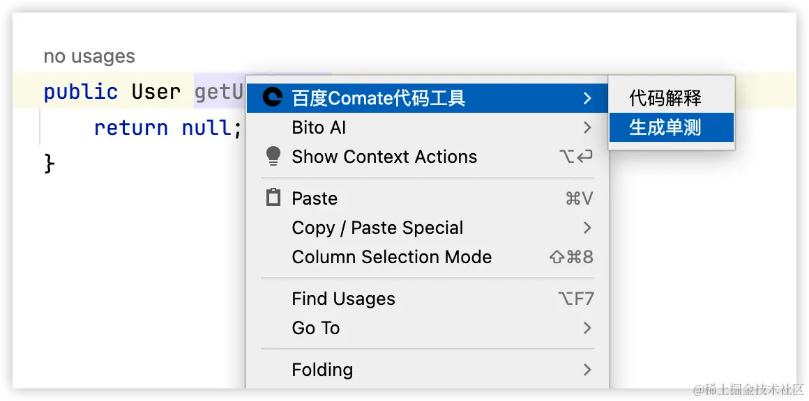 鼠标右键点击函数名前方的 Baidu Comate 图标,选择生成单测或者或右键点击函数名,选择Comate代码工具 → 生成单测。