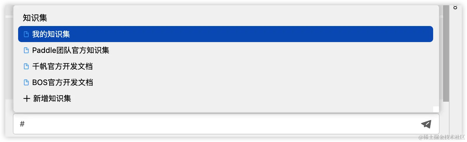 当我们和 Comate 对话的时候,可以通过 # 唤起,然后选择自己的知识库。