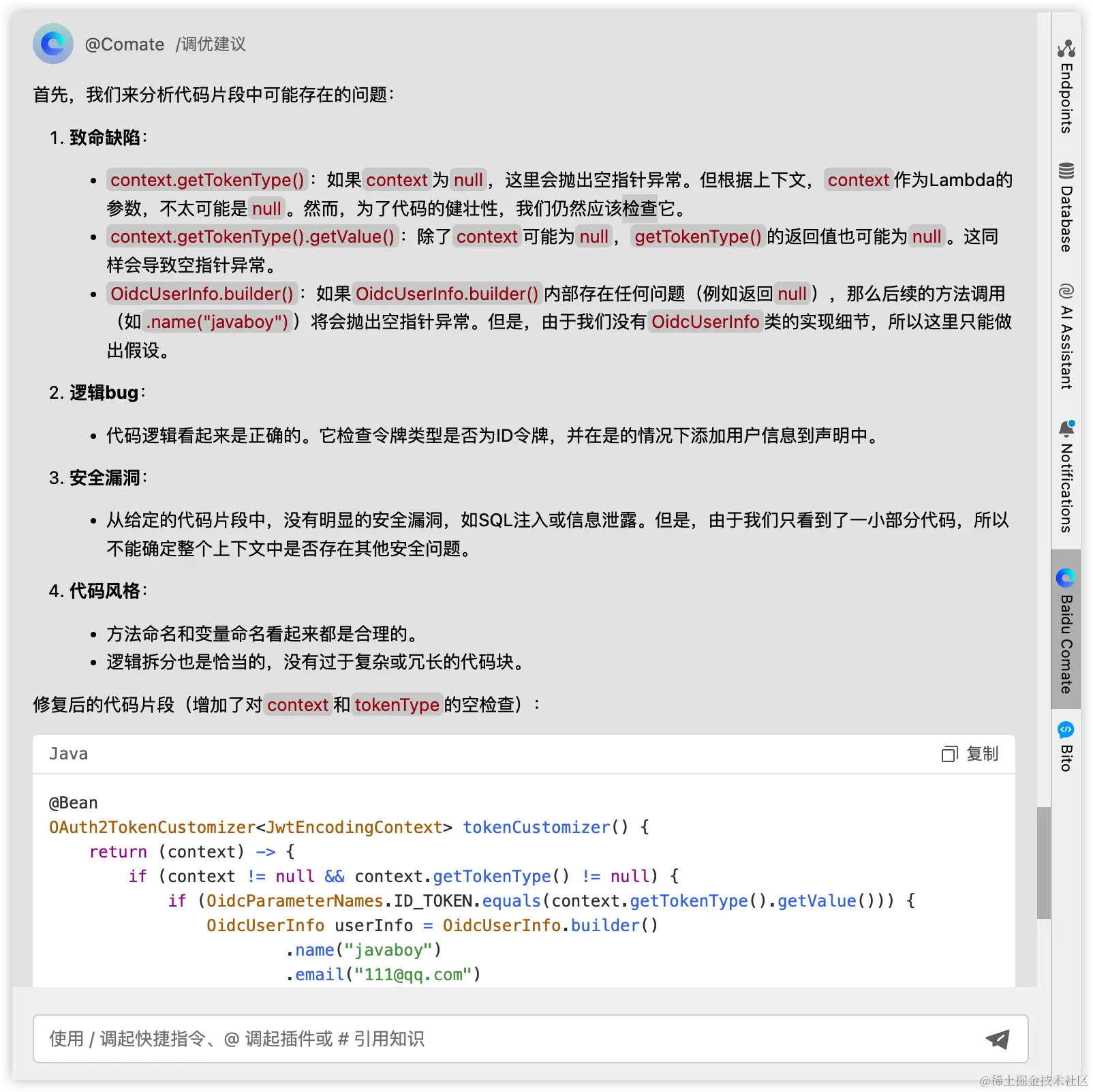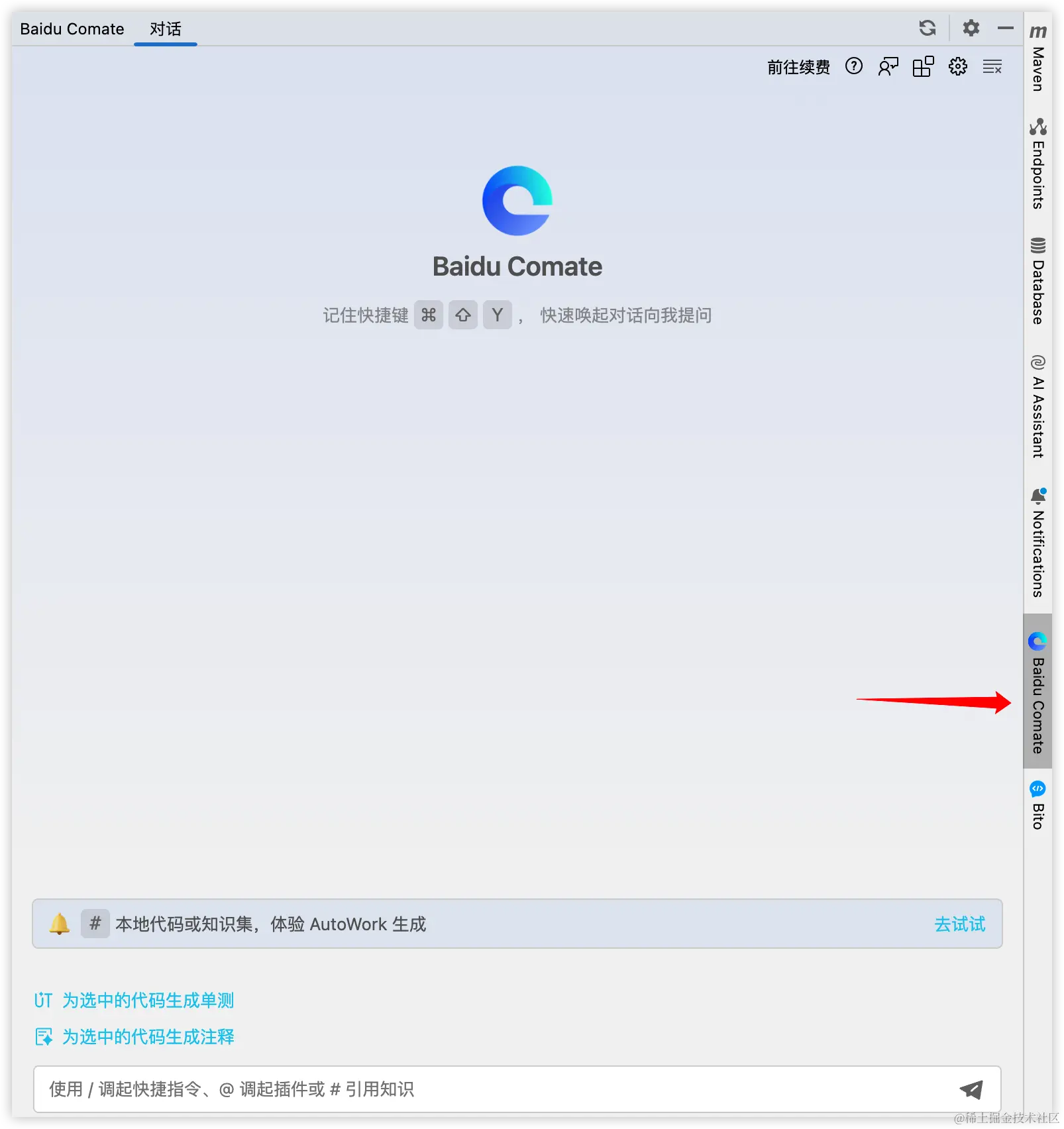 点击 IDEA 右边栏可以唤起 Comate。