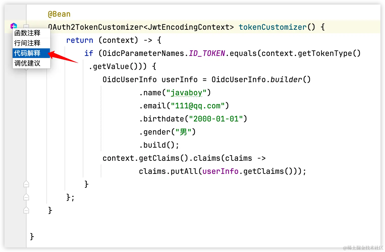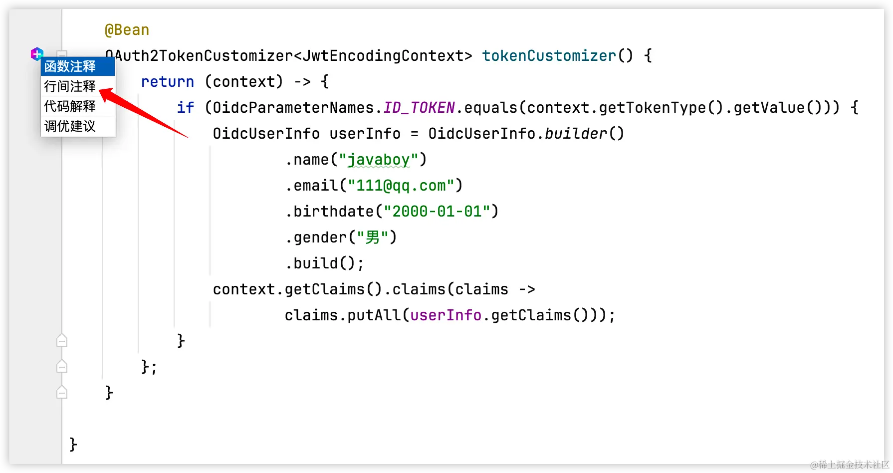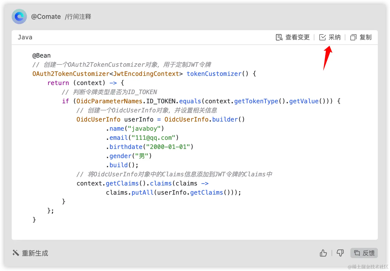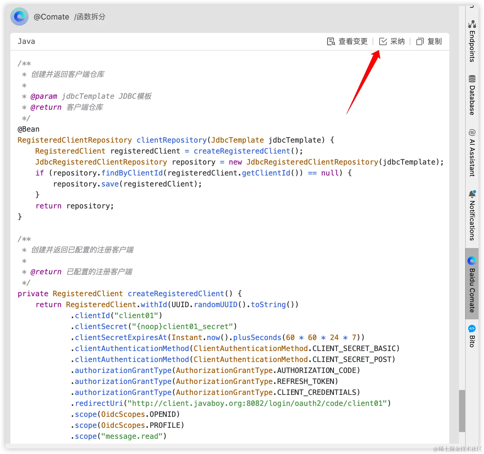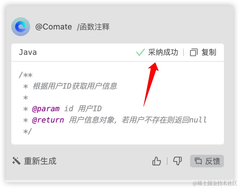 右边会唤起 Comate,代码注释生成之后,点击采纳,注释就会自动添加到方法里边。