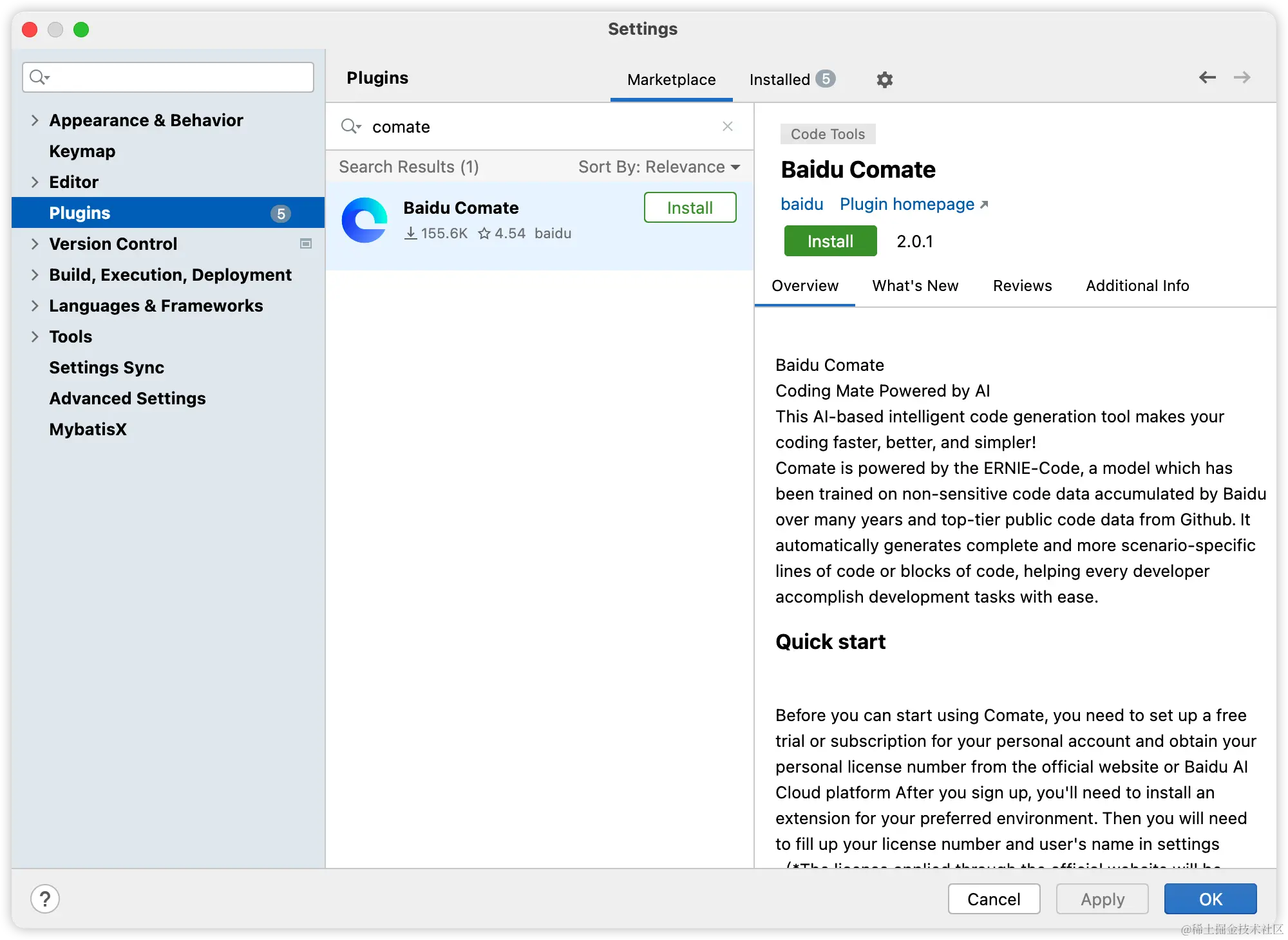 安装比较容易,我们直接在 IDEA 的插件市场搜索 comate 安装即可: