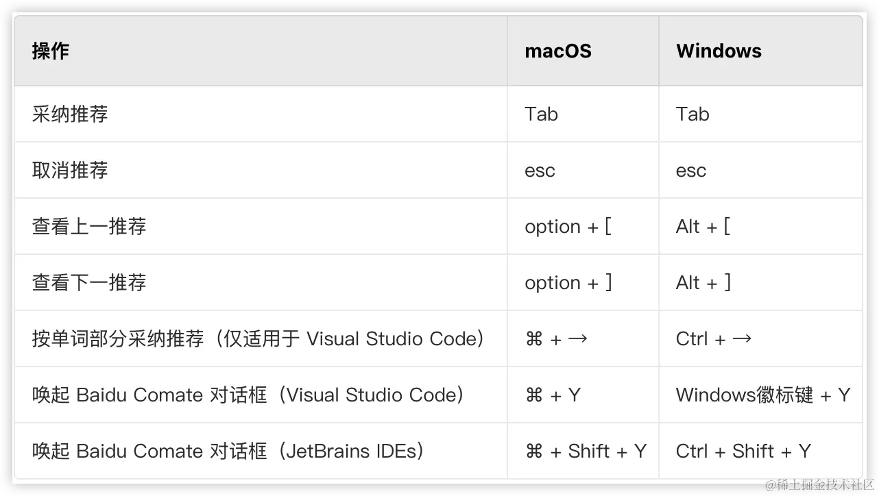 Comate 相关的操作可以参考下面这个表格: