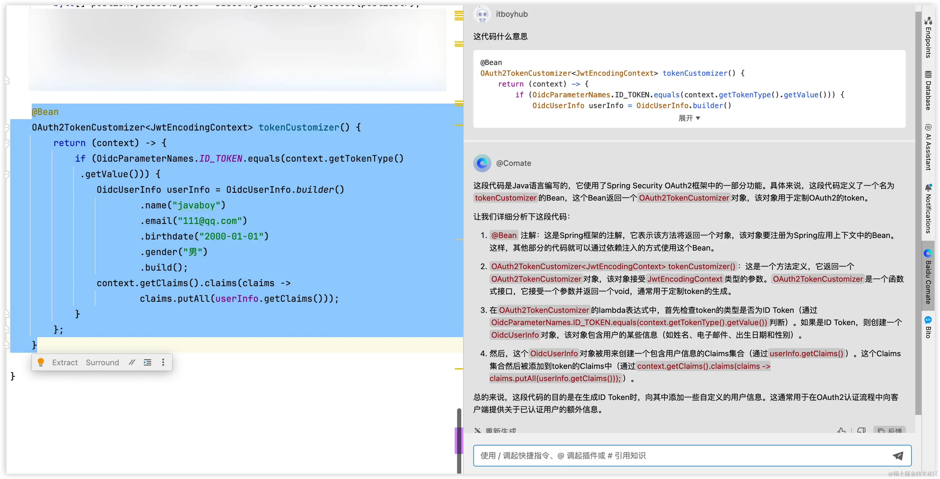 另外也可以选中代码输入问题。先选中代码,然后输入问题,这样 Comate 就会围绕生成的代码来展开对话。