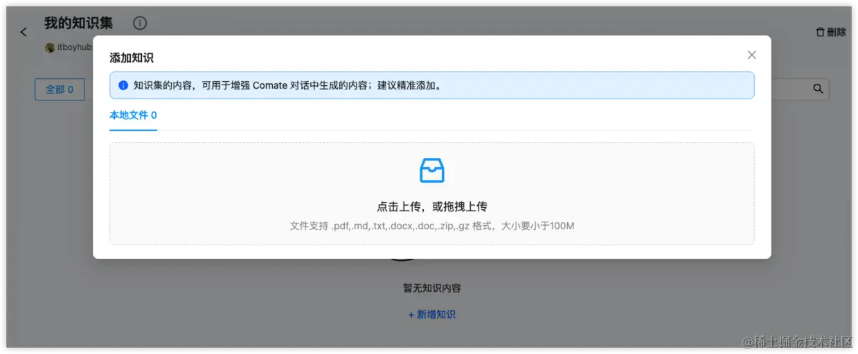 利用 Comate 这个能力,我们可以非常方便的引入自己的知识集,比如松哥写了很多文档,我可以把这些文章内容构建成一个知识集,那么在发起自然语言对话的时候,就会自动使用到我的这些知识集。