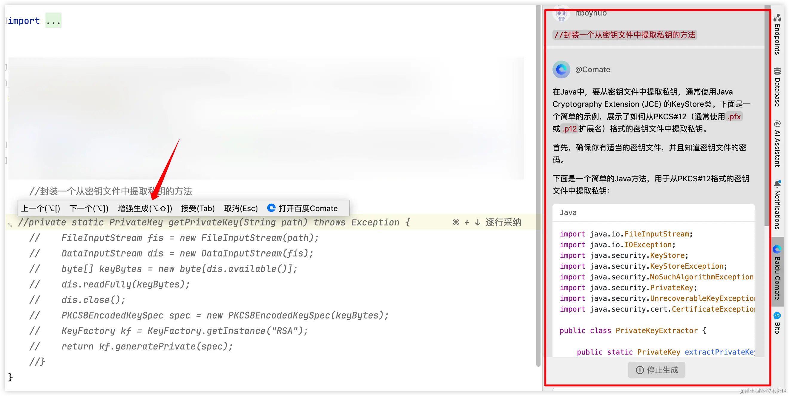 右边会唤起 Comate,代码注释生成之后,点击采纳,就会自动添加到方法头部。