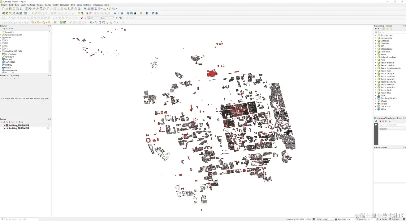 将下载好的建筑的矢量数据加载到QGIS中,对该原始数据进行优化处理。首先在图层框中选中该数据图层,然后点击工具栏中的属性表图标,也可以右键打开属性表。因为该建筑矢量数据的属性表中没有建筑高度数据,无法满足建筑参数化建模的基础属性需求,所以需要对数据进行简单处理,即为建筑随机分配高度。