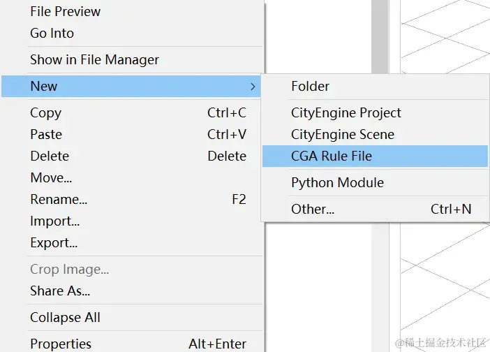 接下来创建建筑生成规则,首先点击”rule“文件夹,右键新建”CGA Rule File“CGA规则文件。
