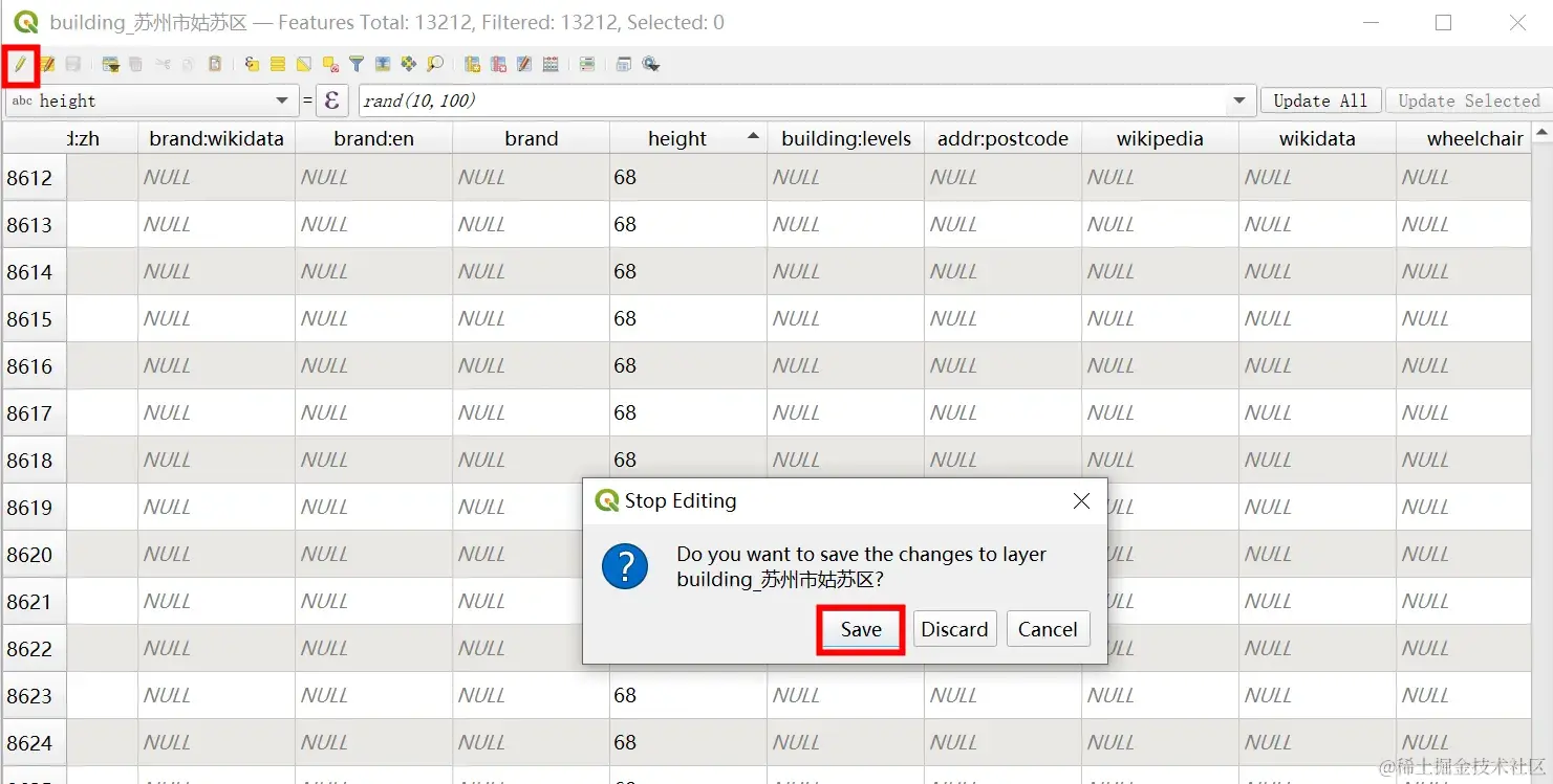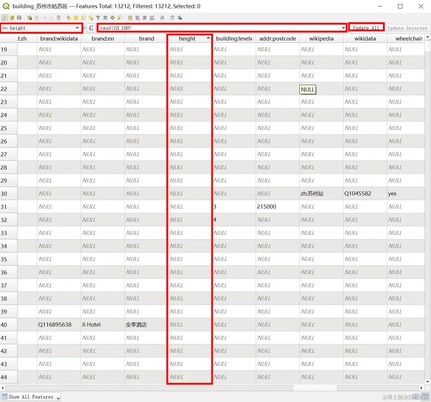 观察属性表可以发现”height“高度属性缺失较多,因此需要给建筑赋予高度。点击下图左侧下拉框选择”height“ 属性,在中间输入框输入函数”rand(10,100)“进行10到100之间高度随机,然后点击运行。