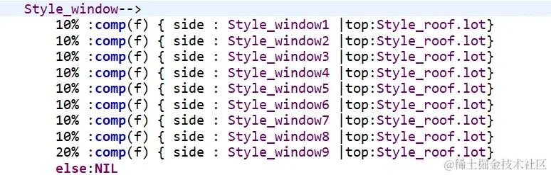 最后就是给分好的类别单独编写建筑的立面样式,可以通过“split”函数分出你想要的建筑段数,从而分配想要的建筑颜色。完成这些步骤的编写,这个随机样式的建筑规则就完成啦。