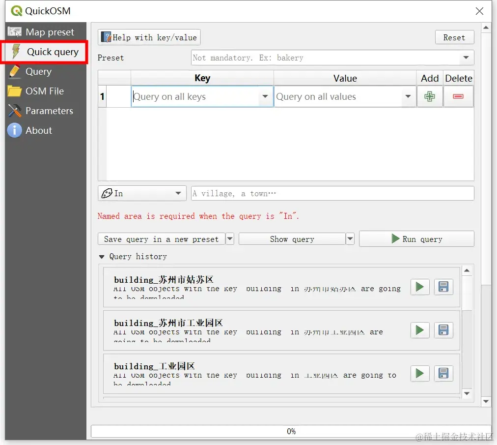 并选择想要下载城市区域,例如”苏州市姑苏区“,点击”Run query“运行。