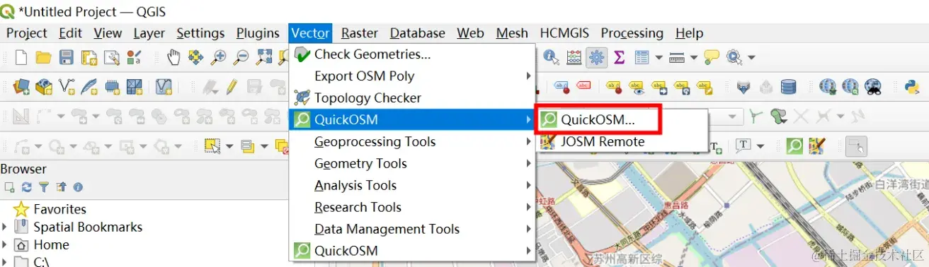 插件安装完毕,可在”Vector“中点击”安装好的“QuickOSM“打开该插件。