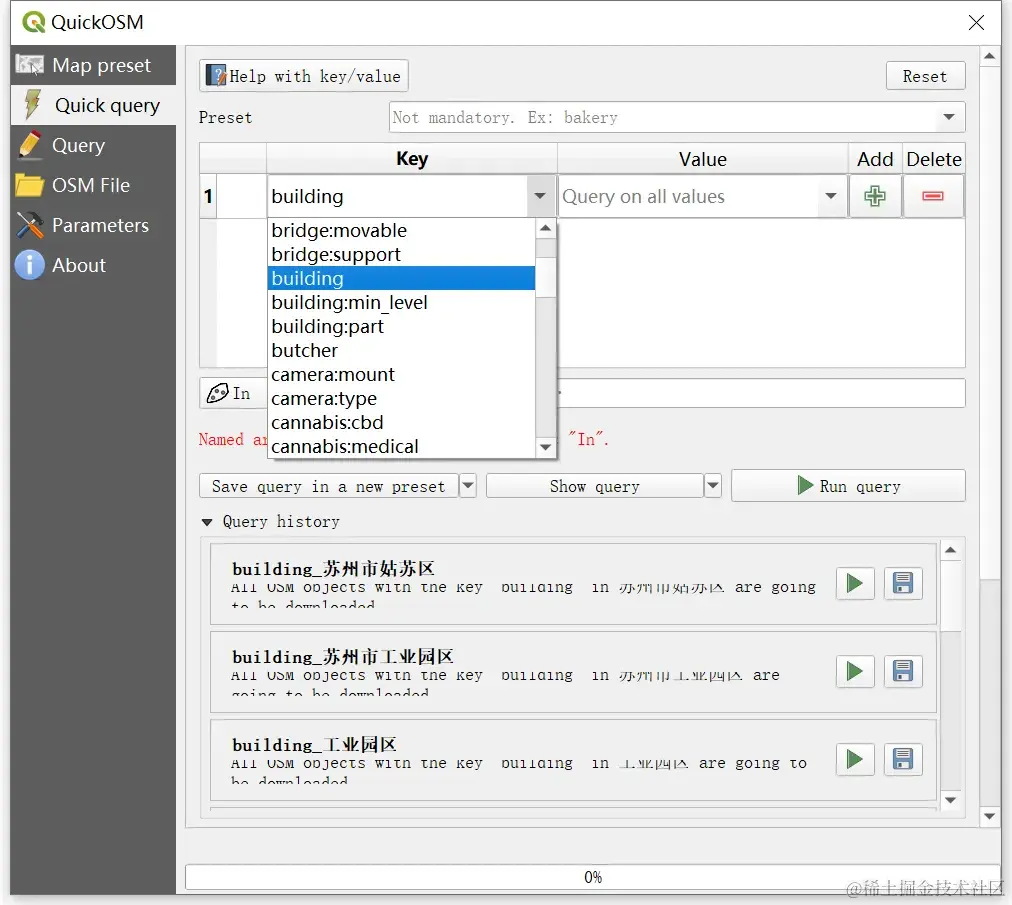 选中“QuickOSM“插件弹窗中的”Quick query“,并在右侧的”key“中筛选想要下载的数据。
