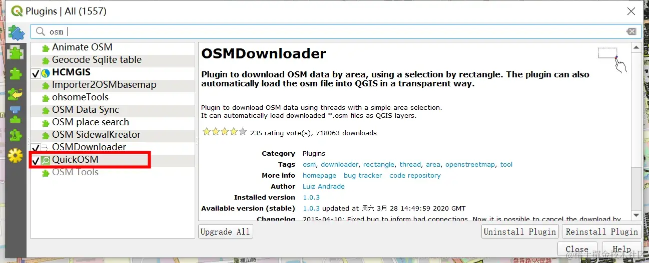 在“Plugings“的搜索框中输入”osm“进行模糊查询,检索到”QuickOSM“插件并进行安装。