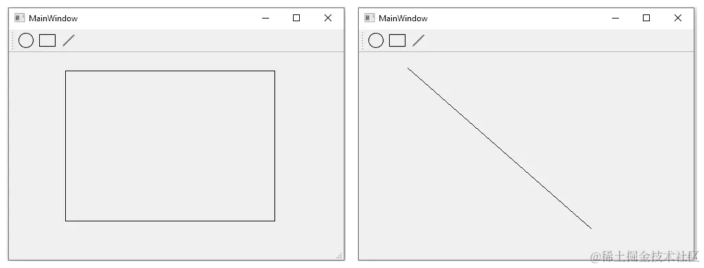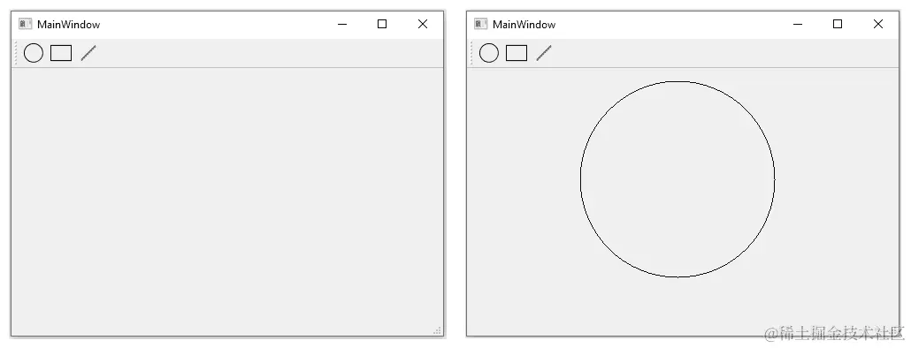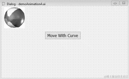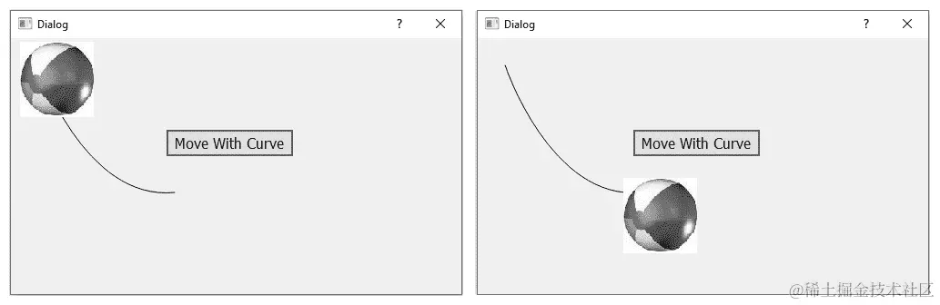 运行应用程序后,您会在屏幕左上角(截图的左侧)找到Push Button小部件和代表球形图像的Label小部件,并在单击Move With Curve按钮后,球会沿着绘制的曲线开始动画,并在曲线结束的地方停止(截图的右侧):