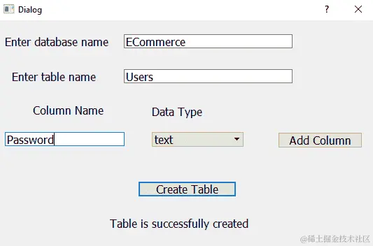 在这个示例中,我们将学习如何创建一个数据库表。用户将被提示指定数据库名称,然后是要创建的表名称。该示例使您能够输入列名及其数据类型。单击按钮后,将在指定的数据库中创建具有定义列的表。