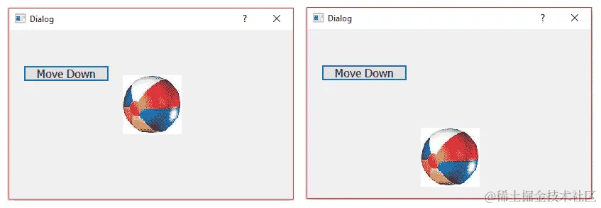 运行应用程序时,您会在屏幕上找到一个推送按钮和一个代表球图像的标签小部件,如下截图所示(左)。点击 Move Down 推送按钮后,球开始向地面动画,并在通过setEndValue方法指定的区域停止动画,如下截图所示(右):