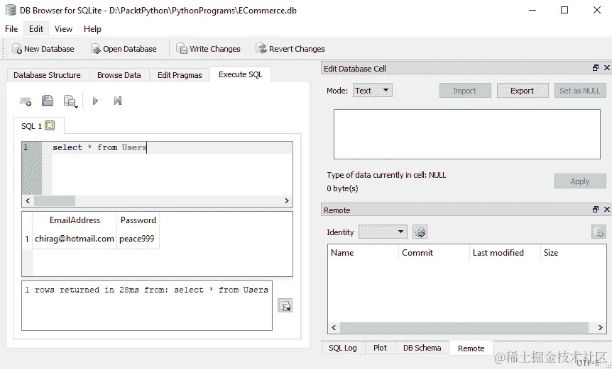 使用cursor对象cur,您可以执行 SQL 语句。例如,以下一组语句创建一个包含三列id、EmailAddress和Password的Users表: