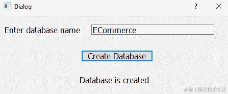 运行应用程序时,将提示您输入数据库名称。假设我们输入数据库名称为Ecommerce。单击“创建数据库”按钮后,将创建数据库并收到消息“数据库已创建”: