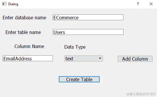 以下是创建一个 GUI 的步骤,使用户能够输入有关要创建的数据库表的所有信息。使用此 GUI,用户可以指定数据库名称、列名,并且还可以选择列类型: