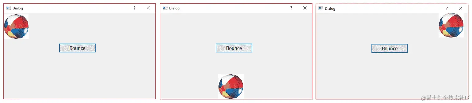 单击 Bounce 按钮后,球开始沿对角线向下动画移动到地面,如中间屏幕截图所示,触地后,球反弹回屏幕的右上角,如右侧所示: