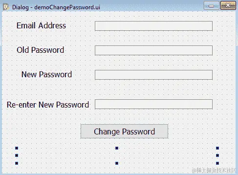 通过拖放五个 Label、三个 Line Edit、一个 Combo Box 和两个 Push Button 小部件到表单上,添加五个 QLabel、三个 QLineEdit、一个 QComboBox 和两个 QPushButton 小部件。