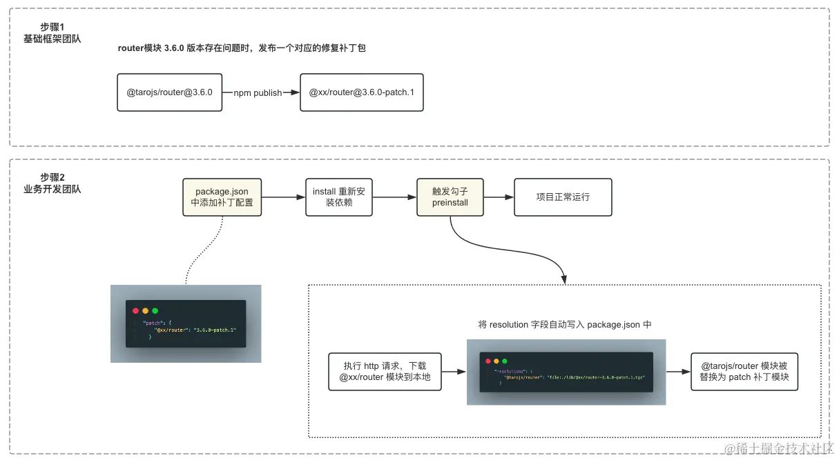 业务团队在项目开发过程中,发现了 1.0.0 版本上的缺陷,基础框架团队则负责在当前版本的源码上进行问题修复,并发布一个补丁包,暂且称为 @xx/patch。然后,业务开发人员只需要在项目中添加一个补丁配置 @xx/patch,并重新安装依赖,通过一种工程化手段就可以将补丁代码生效于开源项目中。