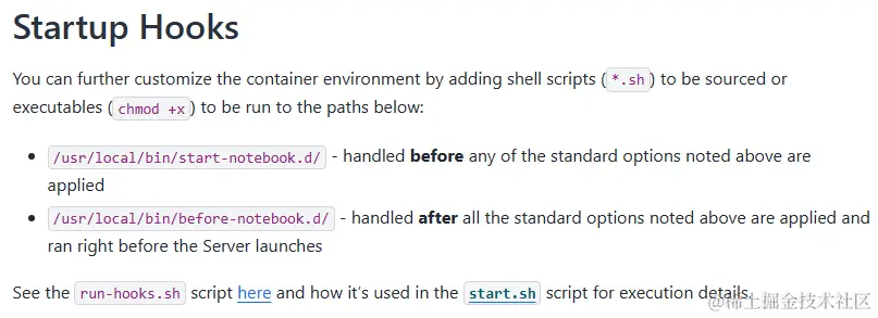 通过对jupyter镜像文档的查看,我们了解到它有两个Hook目录