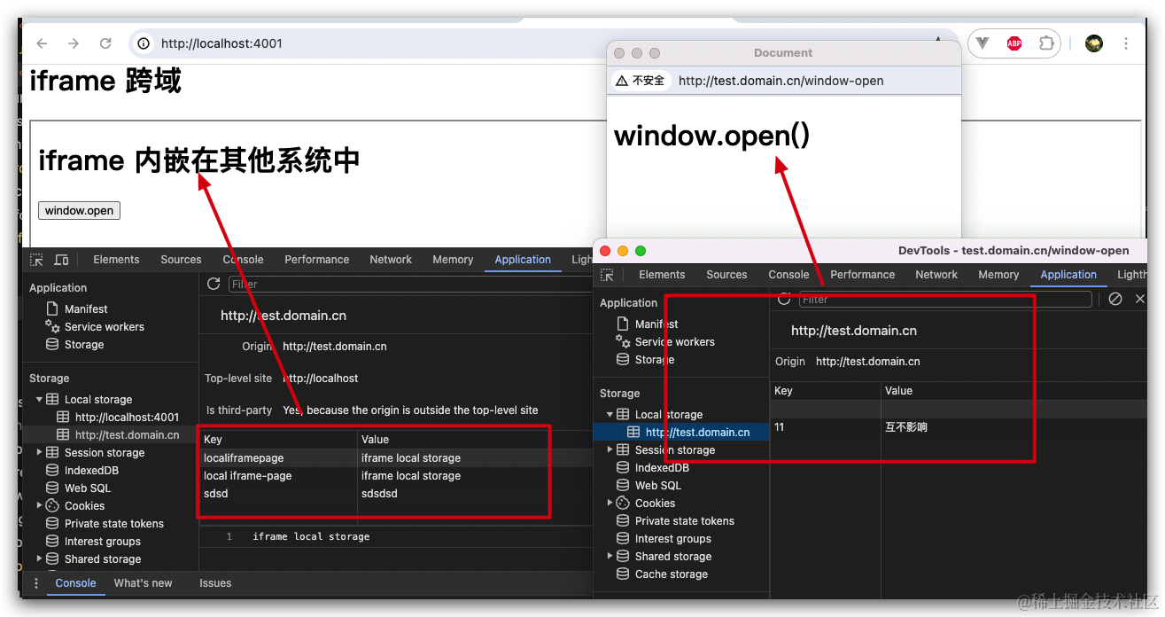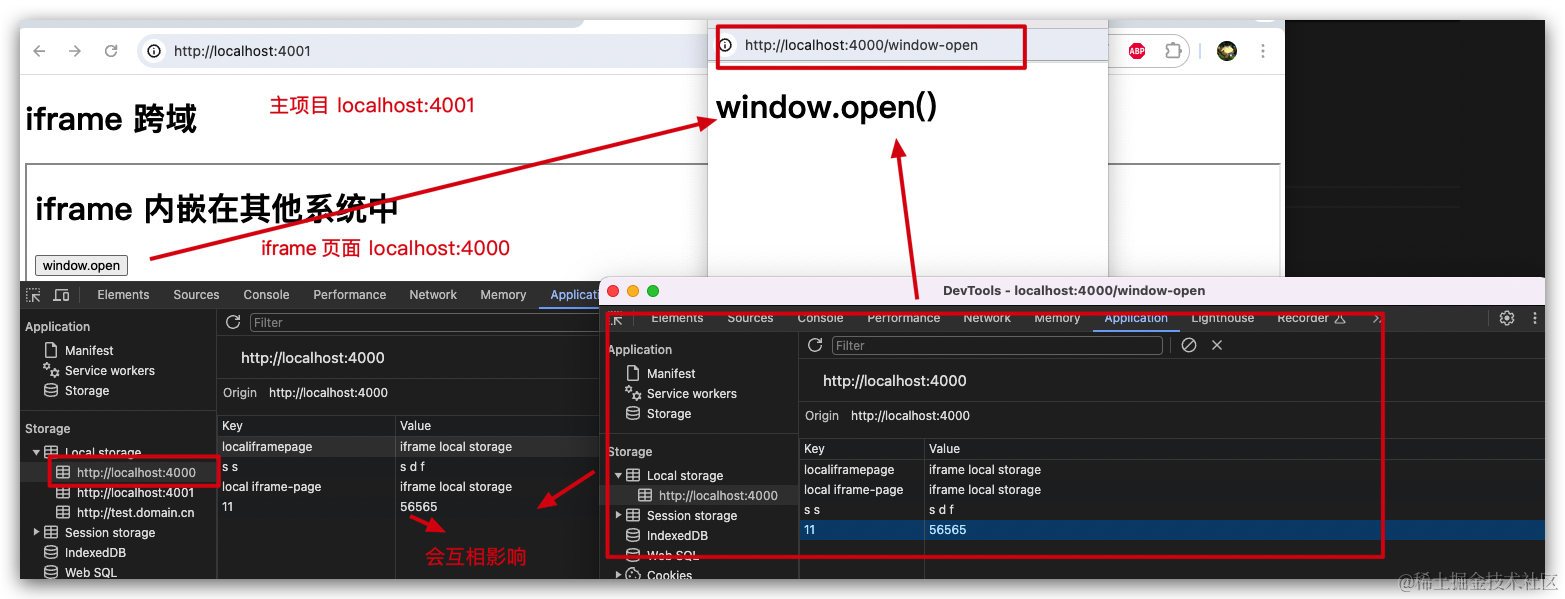 window.open('/a')。会被浏览器认为不同源,从而导致sessionStorage没有从iframe克隆过来,localStorage不共享 - window.open打开的如果是同源页面,会返回一个WindowProxy对象,可以访问原本的window的信息,可以获取localStorage,sessionStorage