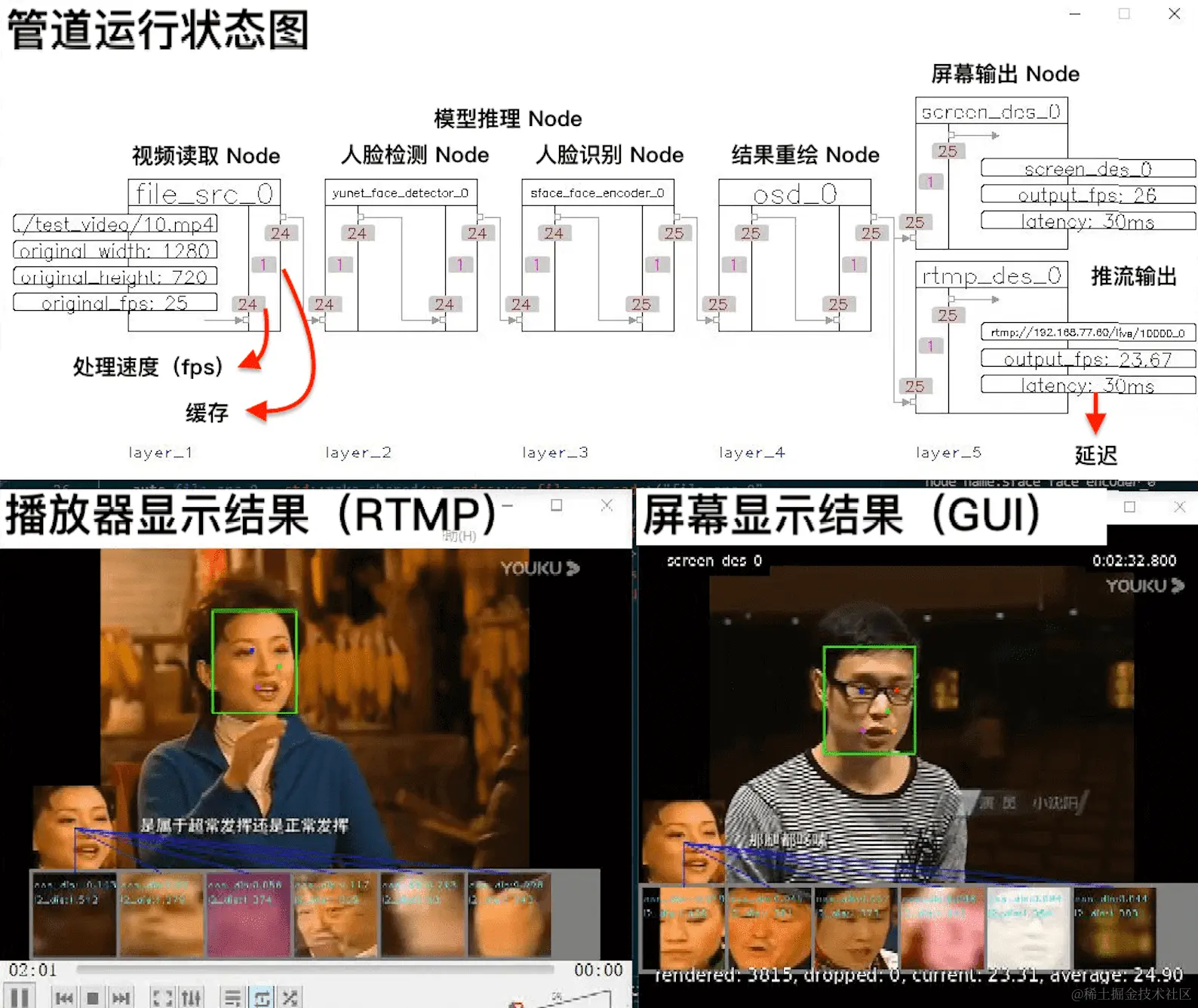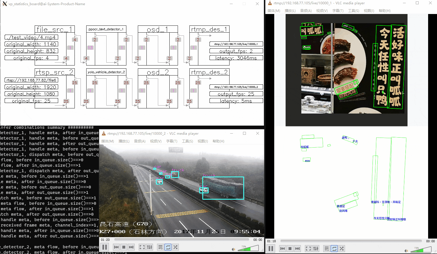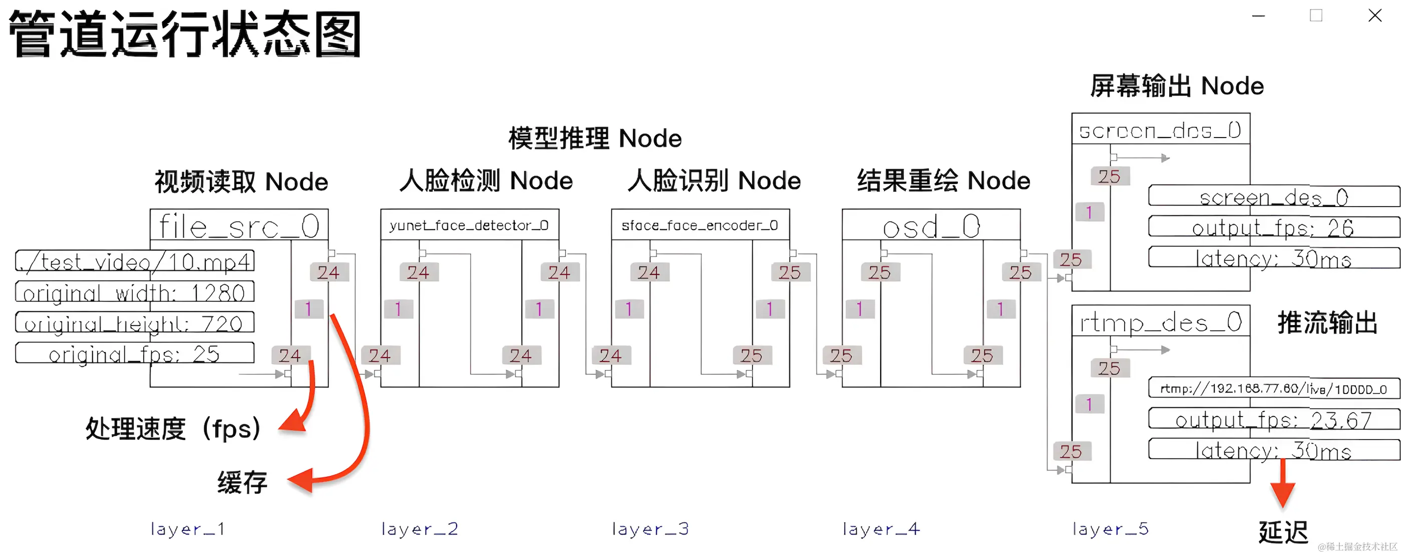 对比功能类似、耳熟能详的 DeepStream(英伟达)和 mxVision(华为)框架,VideoPipe 更易于使⽤和调试、具备更好的可移植性,它完全由原生 C++ 编写,仅依赖于少量主流的第三方模块(如 OpenCV)。同时提供了可视化管道,框架的运行状态会自动在屏幕上刷新,包括管道中每个连接点的 fps、缓存大小、延迟等信息,你可以根据这些运行信息快速定位处理时的瓶颈所在。