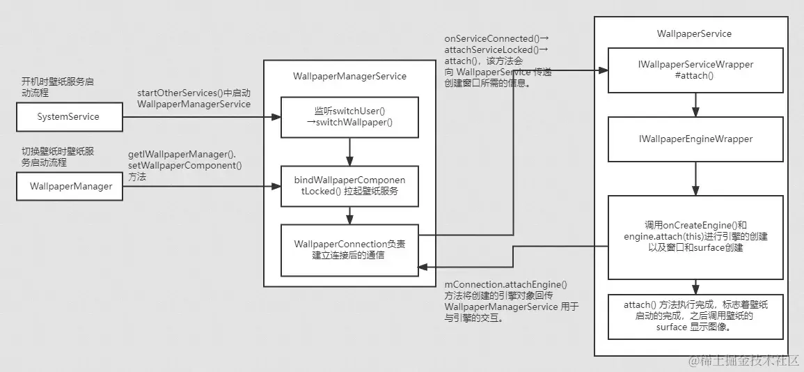 由于 mConnection.attachEngine() 方法将 IWallpaperEngineWrapper 传递给了WallpaperManagerService,因此 WallpaperManagerService 可以转发相关的请求和设置到 Engine 对象中,实现 WallpaperManagerService 到壁纸的通信。onCreateEngine() 方法执行后,引擎创建完成,之后通过 engine.attach()方法进行引擎相关的初始化。