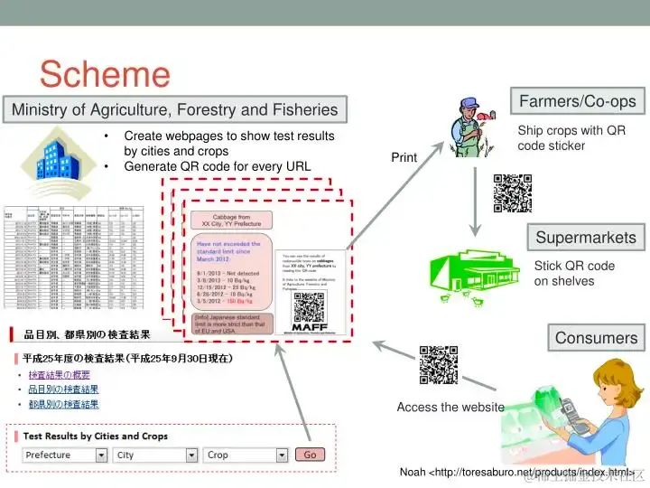 核事故发生后,人们普遍对食品中的辐射污染水平表示怀疑。人们拒绝从零售商那里购买食品,并相信食品安全的保证。前日本政府介入并强制要求在包装上使用二维码以披露食品中的辐射污染水平。轻松获取可信的测试结果有助于公众以一定程度的保证度过怀疑时期。
