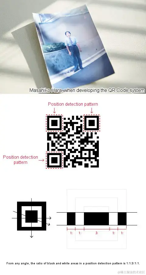 Hara解释说:“因为这种图形在票据等当中出现频率最小”。也就是说,如果附近有同样的图形,读取机就会将其误认为是编码,为了防止这种误读,定位图案必须是唯一的图形。经过全面考虑,原昌宏等人决定将印刷在广告单、杂志、纸板等处的绘图和文字全部变成黑白两色,对其面积比率进行彻底的调查。研发小组日以继夜地对无数的印刷品进行调查的结果,终于查明了印刷品中“最不常用的比率”,即1︰1︰3︰1︰1。这样,便确定了定位图案黑白部分的宽幅比率。所形成的结构是,扫描线可以从360度方向扫描,无论从哪个方向扫描,一旦扫到其独特的比率,便可计算出编码的位置。