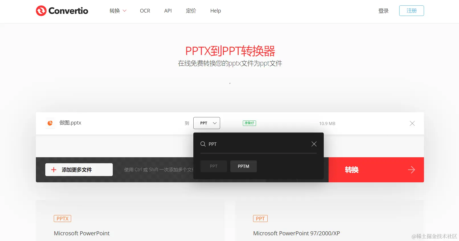 使用方法也非常简单,将本地的 PPTX 文件上传到 Convertio,格式选择 PPT,接着点击下方的「转换」按钮,即可自动将 PPTX 转换为 PPT。