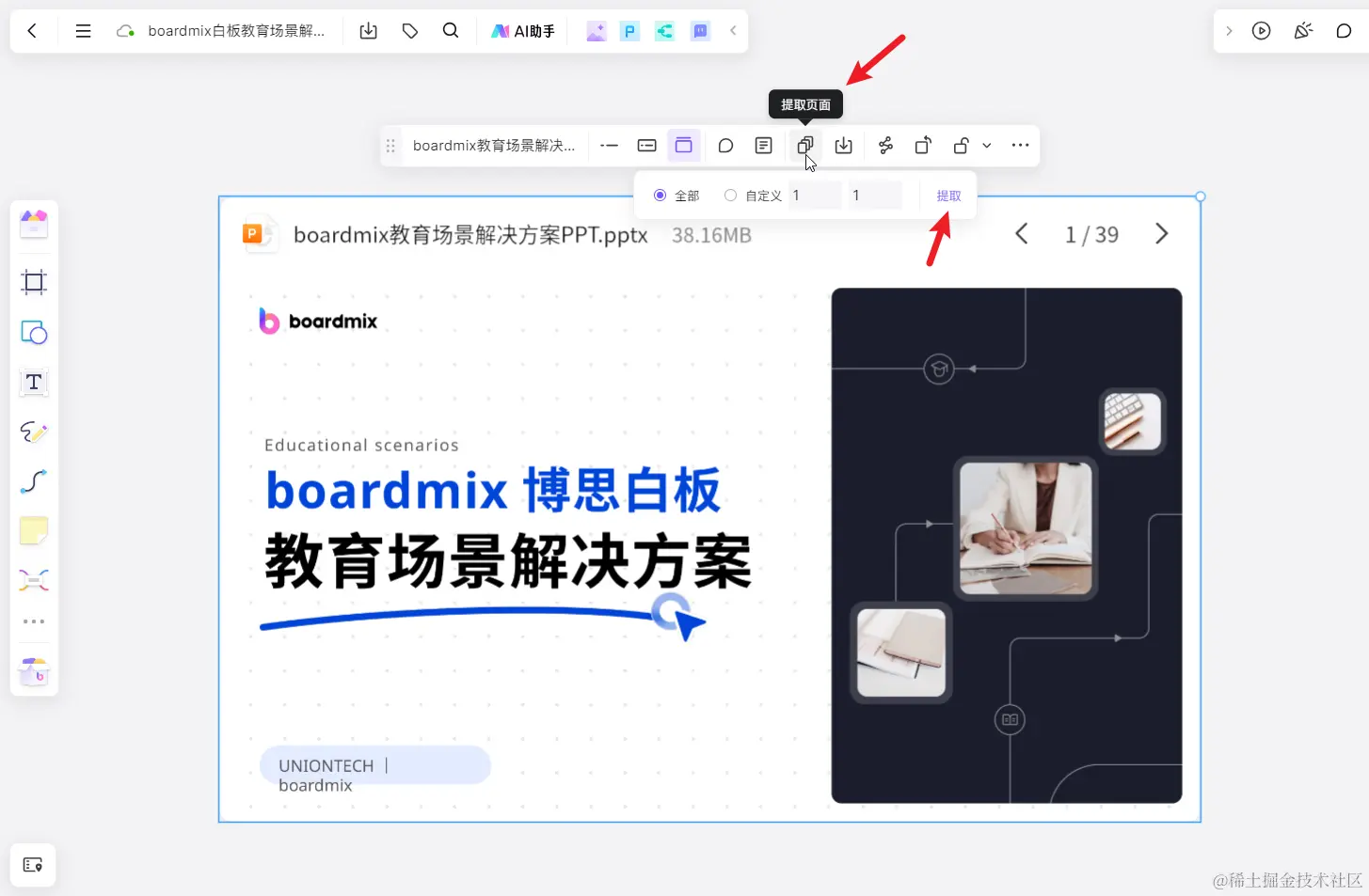 选中 PPT 文件,点击上方工具栏的「提取页面」,下方会弹出一个浮窗,点击右侧的「提取」按钮,提取出 PPT 包含的所有页面。