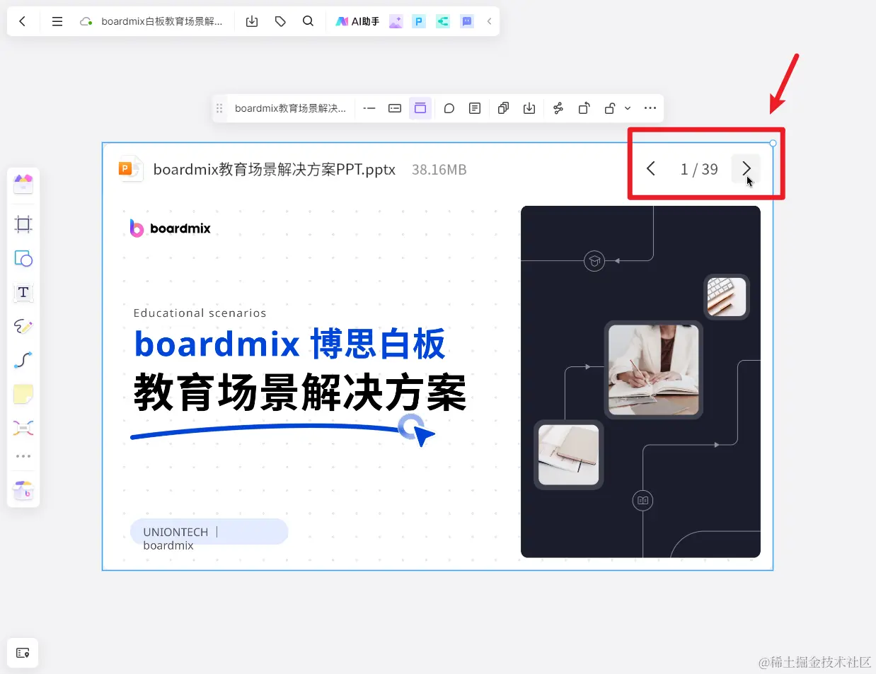 选中上传到 boardmix 画布的 PPT 文件,点击右上角的翻页按钮,即可在线查看 PPTX 文件的内容。