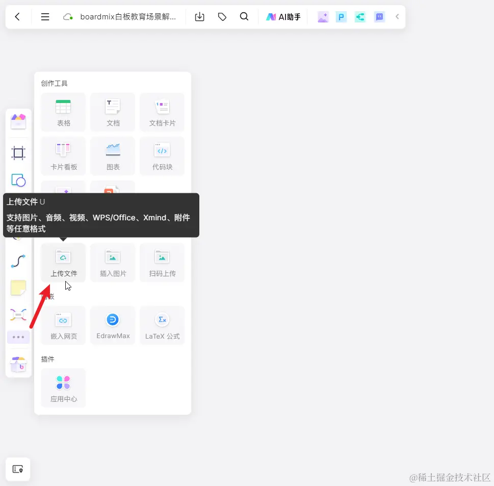 在打开的 boardmix 演示文件中,点击左侧工具栏的更多工具「…」,选择「上传文件」,将本地的 PPTX 文件上传到 boardmix 画布中。