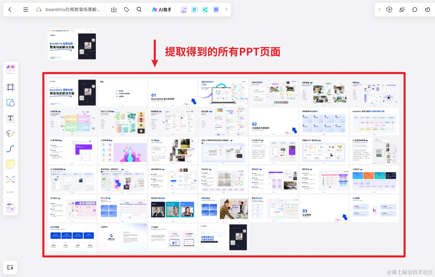 提取得到的 PPT 页面,会自动转换为图片,按页面顺序自动排列在 PPT 下方,如下图所示,可从左到右、从上往下依次查看所有 PPT 页面。