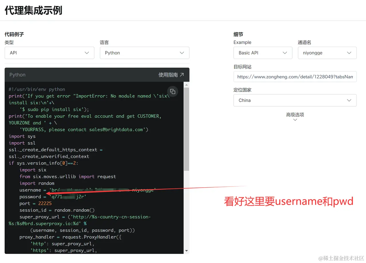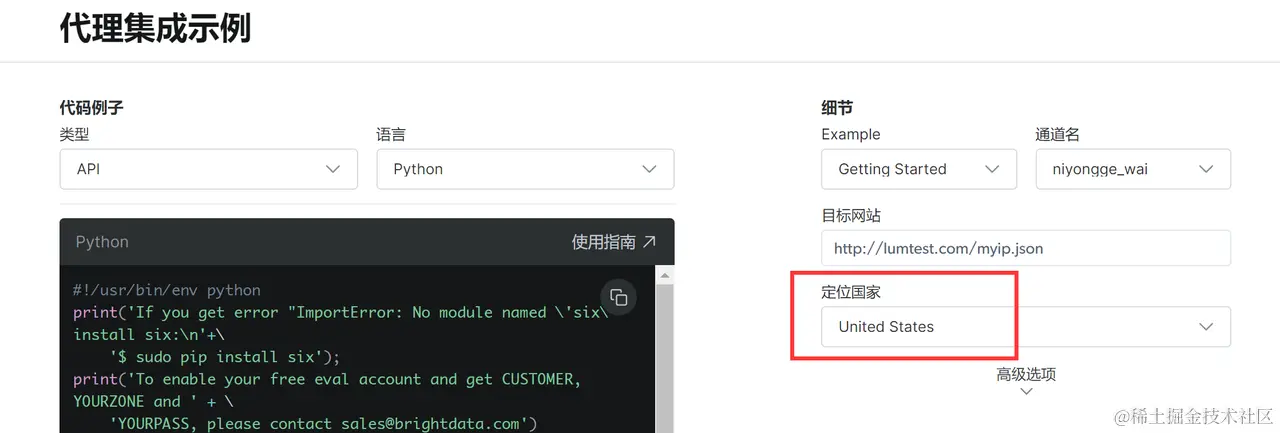 在代理集成示例中我们选择对应的API_python语言的代码,细节就无所谓了,定位是China。