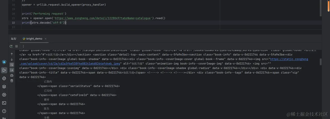 我们来分析一下系统提供的代码,这里访问的是国内的一款小说网站,模拟爬取的第一步操作,获取页面。