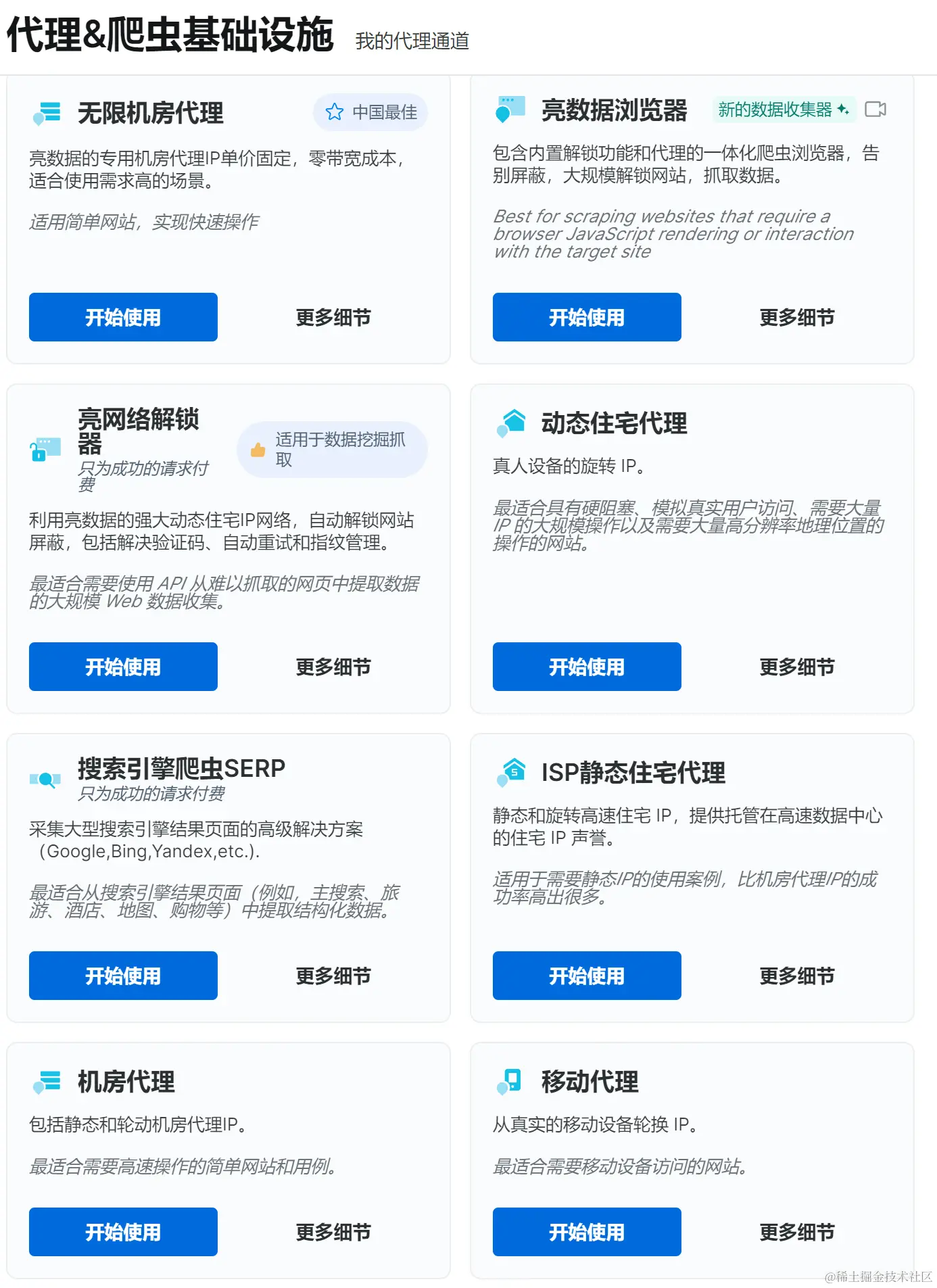 登录后就能直接进入到亮数据的后台首页了,可以直接看到【代理&爬虫基础设施】,这就是我们主要使用的功能,他这里用的是最开修饰的【最快且稳定的代理网络,静态动态IP覆盖全球195个国家,告别反爬限制和封锁。】这个最代表什么,我们可想而知,起码我们爬取数据的时候再也不需要设置随机间隔时间了,下方包括中介绍了具体的一些功能,动态住宅保障自身安全,静态住宅ISP和机房代理能让我们稳定使用,移动代理这个也好,随时随地保护自己。