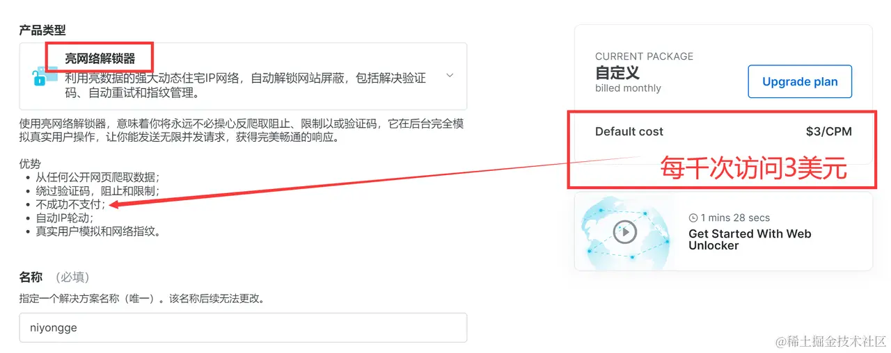 这里我用的是亮网络解锁器来做个测试,每千次成功访问才3美元,还是比较划算的。