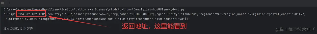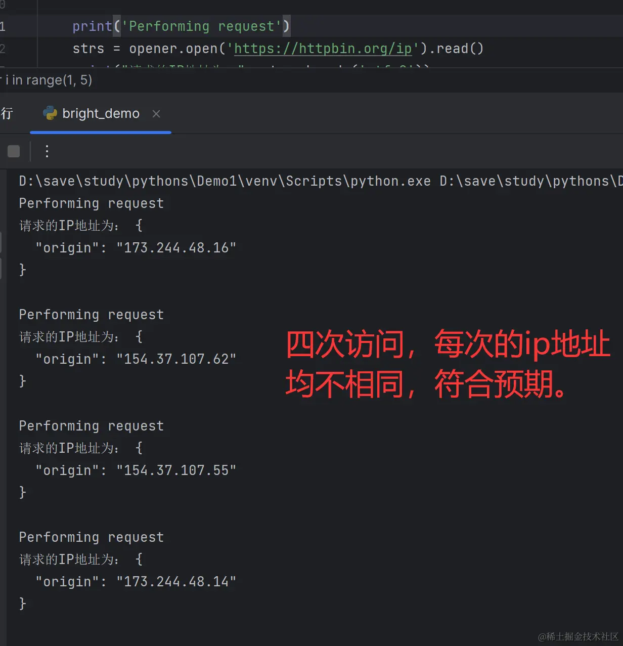 我们使用:httpbin.org/ip 来查看返回的ip地址。