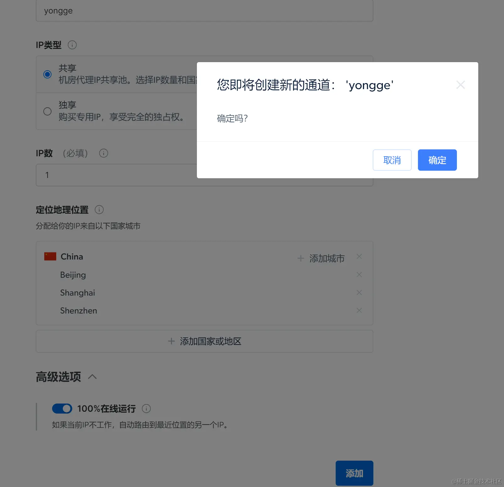 可以选择获取的ip地域,我这里选择的是咱们国家的三个城市,直接点击创建即可。